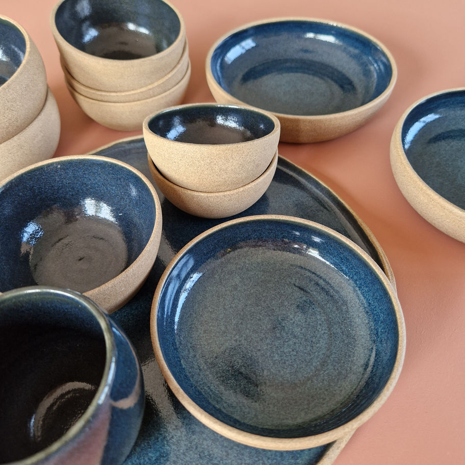 Tapas set NIGHT straalt elegantie uit met diepe nachtblauwe glazuur en een rand van pure, ongeglazuurde klei.
