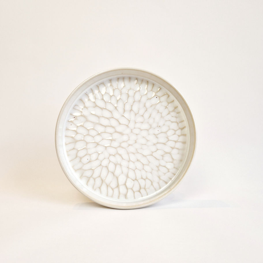Een handgemaakte keramiekserie met glanzend witte glazuur en organische texturen. Elk stuk is voorzien van een uniek reliëfpatroon dat doet denken aan bergstructuren of gestolde rotsformaties. Het reliëf ontstaat door zorgvuldig klei met de hand weg te nemen, wat elke vorm uniek maakt.