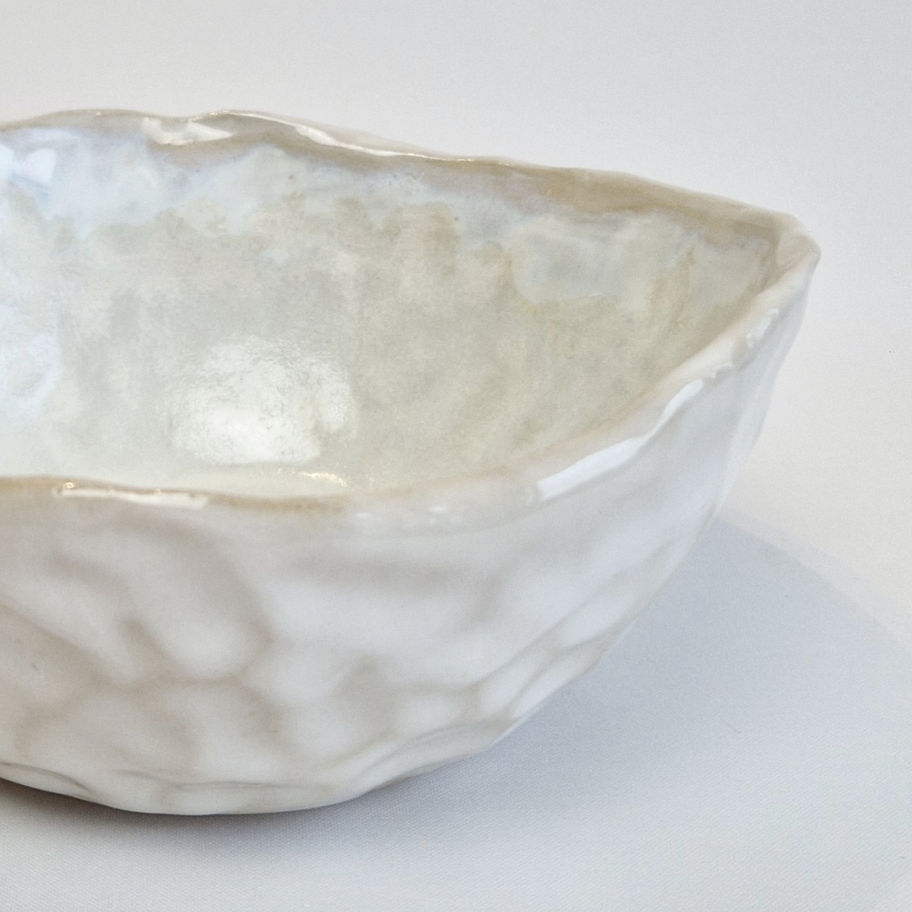 Een handgemaakte keramiekserie met glanzend witte glazuur en organische texturen. Elk stuk is voorzien van een uniek reliëfpatroon dat doet denken aan bergstructuren of gestolde rotsformaties. Het reliëf ontstaat door zorgvuldig klei met de hand weg te nemen, wat elke vorm uniek maakt.